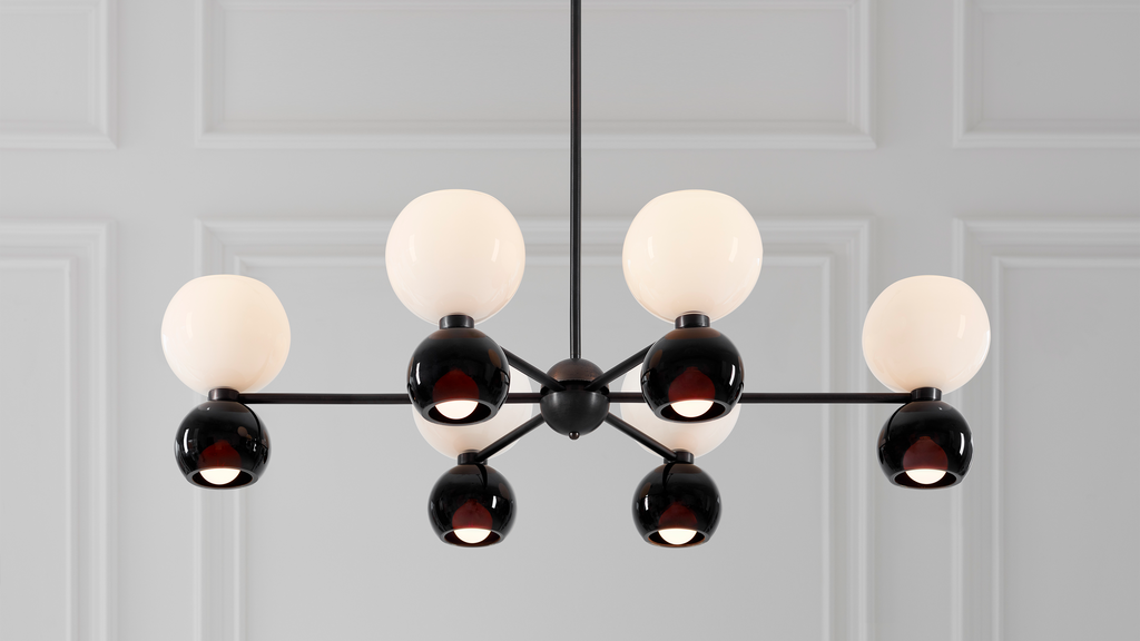 Going formal in black and white, the Betty Oval Chandelier showcases luminous hand-blown glass.
