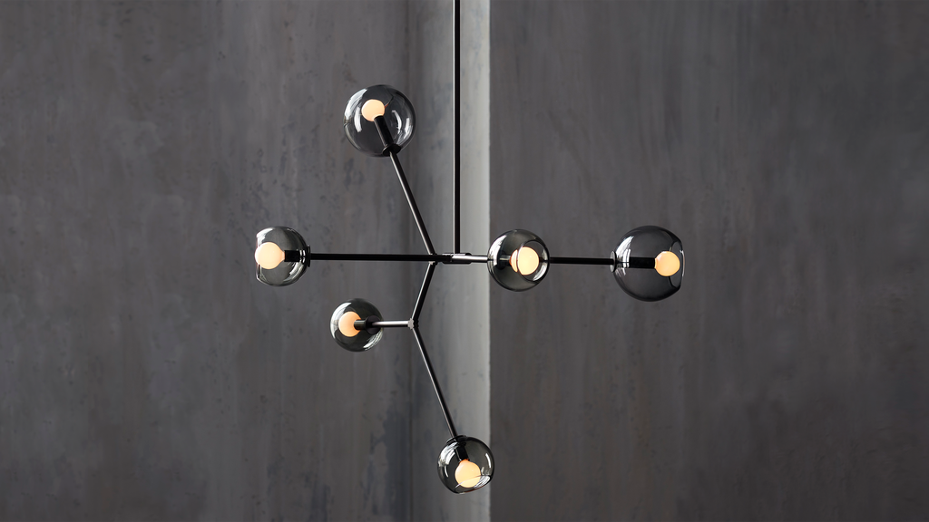 Blown-glass spheres balance vertically and horizontally creating a light, graceful composition.
